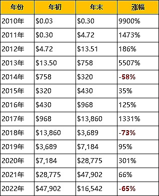 (5)以下为2010-2022年以来BTC的年初和年末价格对比,根据过去12年BTC的价格表现,4年一次行情节点,接下来可能会逐渐开始上涨行情。