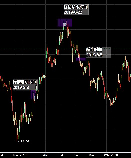 (2)历史上,比特币已经经历了3次区块奖励减半,(因AIcoin展示的K线为2017年之后,以下通过文字叙述行情变化)