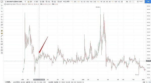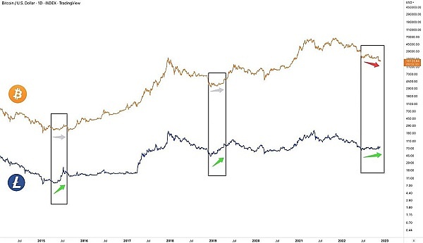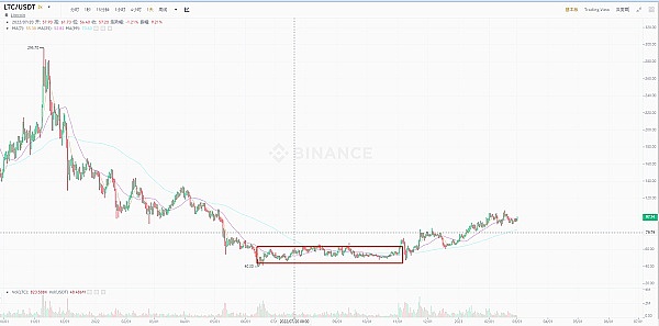 2021年5月10日,LTC达到顶点$413,BTC是在11月9日,达到顶点$67,549;2022年6月14日,LTC达到最低点$40,BTC是在11月21日达到最低点$15,476,LTC的顶点和底部中间隔了400天。