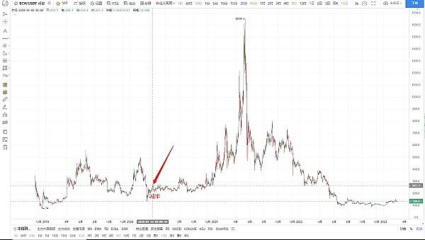 (2)从K线图可知:LTC围绕55-60左右的价格近半年时间,底部构造比较充足,是最佳的买入点,现在回头看随着市场的炒作以及2023年年初的行情,已经翻了快1倍,相比上一次减半,LTC 直接从2018年12月的$22上涨到2019年6月$146U,上涨了6倍以上,预计2023年6月份行情结束前,还有2-3倍的空间。