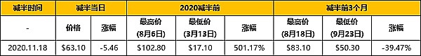 (1)目前,ETC已经完成了3次减产,每次的减产幅度是20%,第一次减产,是在2017年11月3日底部开始上涨,12月20日达到最高点;第二次减产之前,加密资产市场发生了「3·12」暴跌,ETC在减产前40天内由最高$13.2跌至最低价$3.1,跌幅是-329.97%;第三次减产是在22年的4月25日,从3月16日至29日间,ETC从$25.6美元上涨至最高$52.66,涨幅达到105.7%,成为当时为数不多表现亮眼的项目,即将到来的减产显然是这次上涨的催化剂。总体表现看,ETC在减产前的30-40天就有一次波段行情。