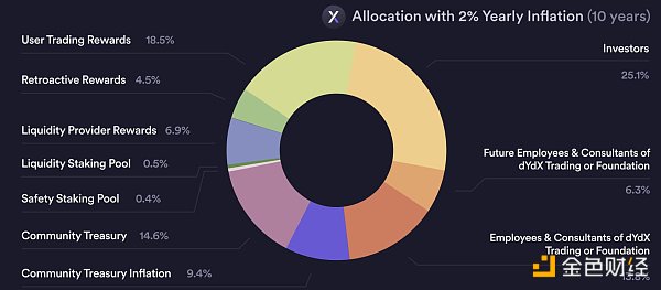 其中,DYDX 总供应量的 50%(5亿枚 DYDX)在 5 年内分配给社区,其余 50% 分配给早期投资者、协议开发者、社区成员和国库等。但是目前只能将把重点限制在社区分配比例上,因为这是唯一可以改变的事情。