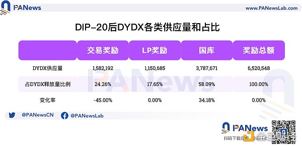 而本次DIP-20降低交易奖励后,多余的的DYDX将被存入国库,事实上,降低交易奖励存入金库是dYdX历来做法。在之前的DIP-14中,便将质押 USDC 的奖励设置为 0,并将之前分配给 USDC 质押者的约38万枚 DYDX 存入国库中;而在DIP-16中,社区已经决议减少25%的交易奖励,并将交易奖励从 约380万枚DYDX 减少至 约280万枚DYDX,剩余的约 95万枚 DYDX 存入国库;而在DIP-17中,已经将质押 DYDX 的奖励归零,并将之前分发给质押者的约 38万枚 DYDX 存入国库。