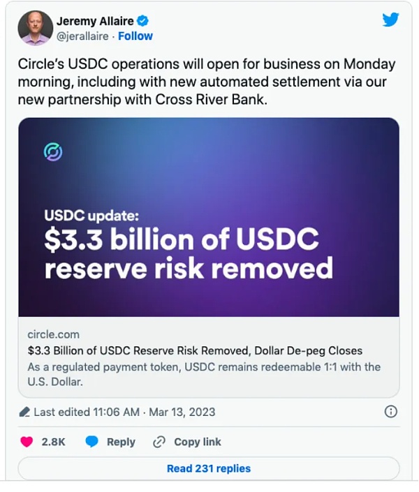 Allaire还指出了Circle因Signature Bank倒闭而遭受的问题,即Circle无法再使用该银行的SigNet结算网络。Allaire在推特上表示,Circle将立即改用Cross River Bank的服务。