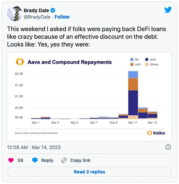 Axios记者Brady Dale说,与此同时,许多人利用这个机会以较低的价格偿还他们以美元计价的DeFi贷款,DeFi借贷平台Aave和Compound上的还款在周六激增。在这种情况下,用户可以通过购买更为便宜的USDC来偿还贷款。