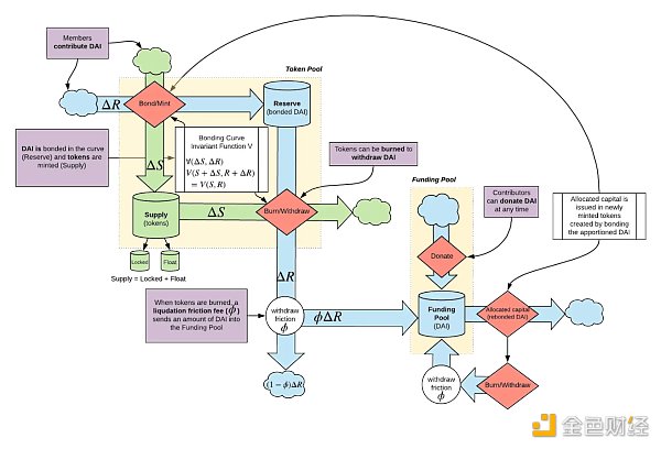 上图是添加了一些有趣内容的增强结合曲线。增加的内容包括「孵化期」,即铸币前期阶段,早期投资者可以存入资金以获得代币并做出早期贡献。一些资金直接流向曲线本身,一些资金流向国库,这些资金可用于联合曲线外的资本配置,以促进产品的发展。除此之外,还有一个在初始阶段授予「孵化器」代币的归属时间表,以及卖家支付少量费用的退出税,该费用被重定向成曲线。Commons Stack 甚至提供了一个可以在网站上使用的模拟器,它被认为是为公共物品提供资金的有效方式。