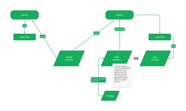 质押锁定:用户可以将 $ACID 锁定,以获得 ETH 节点运营的收益。锁定时间越长,收益越高,国库管理大量的 LSD 资产,获得以太坊质押奖励。国库也会通过 DeFi 策略获得额外收益,90% 的资金投资于低风险的项目,而 10% 的资金投资于高风险项目。