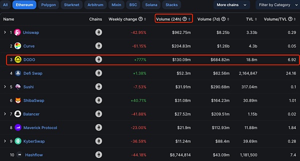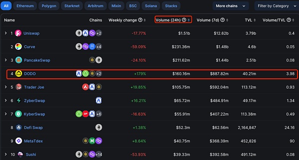 过去一周 DODO 在主网的交易量上涨 777%,全链交易量上涨 179%,Top 10 DEX 中增量最多;
