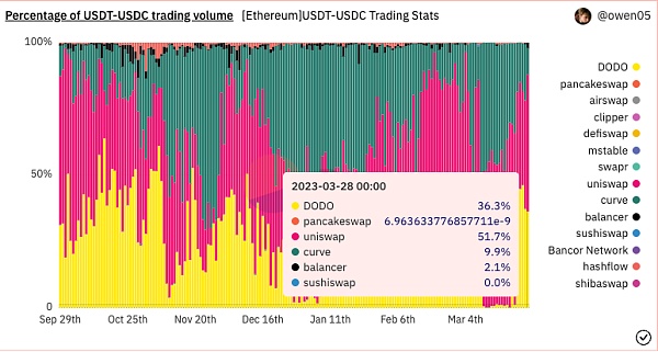 DODO 在 USDT-USDC 最主要的稳定币对的交易量占有率目前已经达到 36.3%,Uniswap 为 51.7%,Curve 为 9.9%。