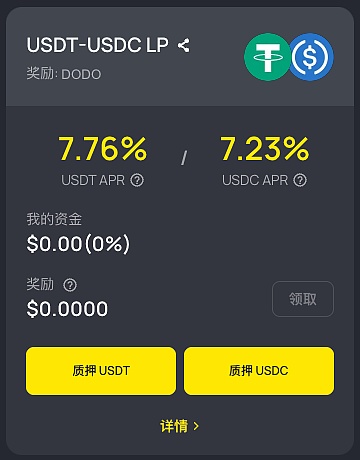 目前 DODO USDT 的单币流动性挖矿收益为 7.76%, USDC 是 7.23%。
