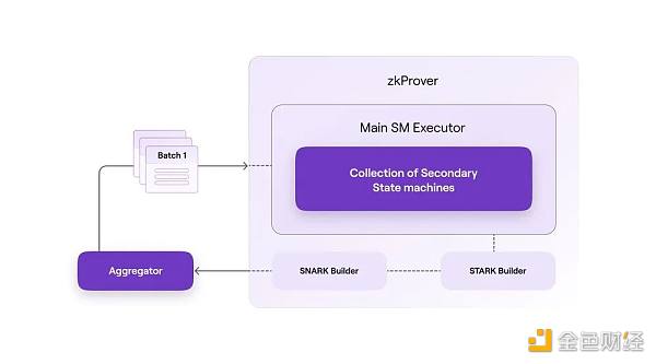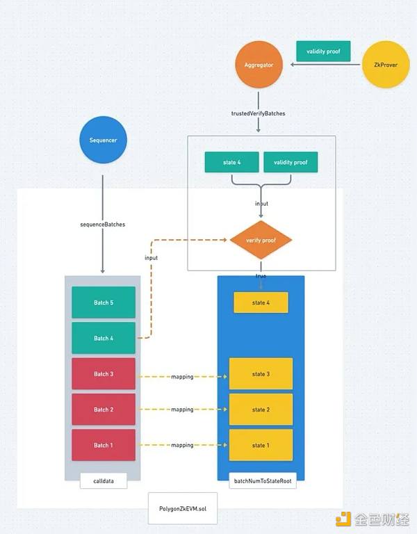 1) 当Aggregator监听到L1的 PolyonZKEVM.sol 合约中已经有新的 Batch 被成功的提交之后,它会把这些 Batch 同步到自己的节点里,然后给 zkProver 发送这些交易。