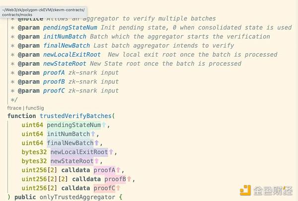 Aggregator 会将这个有效性证明(Validity Proof)以及对应的这些 Batch 执行后的状态一起提交到 L1 的Polygon zkEvm.sol 合约内,通过调用以下方法: