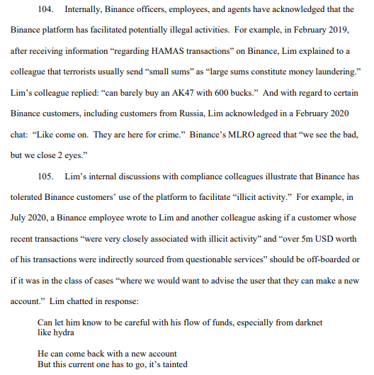 “例如,2019 年 2 月,在收到关于 Binance 上‘关于 HAMAS 交易’的信息后,Lim 向一位同事解释说,恐怖分子通常发送‘小额资金’,因为‘大额资金构成了洗钱’。”