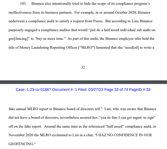 “但根据 Lim 的说法,Binance 故意聘请了一名合规审计员,该审计员‘只对地理进行评估的个人审计’,以‘为我们争取更多时间’,”CFTC 在诉讼报告中写道。