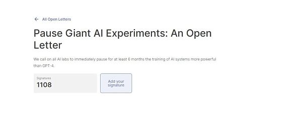 3月22日,生命未来研究所 (Future of Life) 向全社会发布了一封《暂停大型人工智能研究》的公开信,呼吁所有人工智能实验室立即暂停比GPT-4 更强大的人工智能系统的训练,暂停时间至少为 6个月。