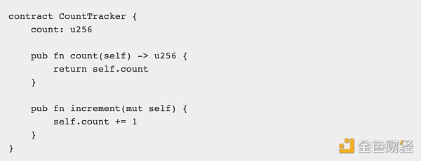 方法可以在模块级别或合约内声明,默认是 pure 和 private。要使合约方法公开,必须在定义前加上「pub」关键字,这使得它可以在外部访问。要从持久化存储变量中读取,方法的第一个参数必须是「self」,在变量名前加上「self.」,使该方法具有只读访问本地存储变量的权限。要读取和写入持久化存储,第一个参数必须是「mut self」。「mut」关键字表示合约的存储在方法执行期间是可变的。访问环境变量是通过将「Context」参数传递给方法来完成的,通常命名为「ctx」。
