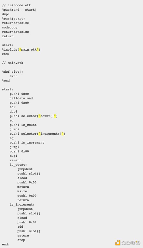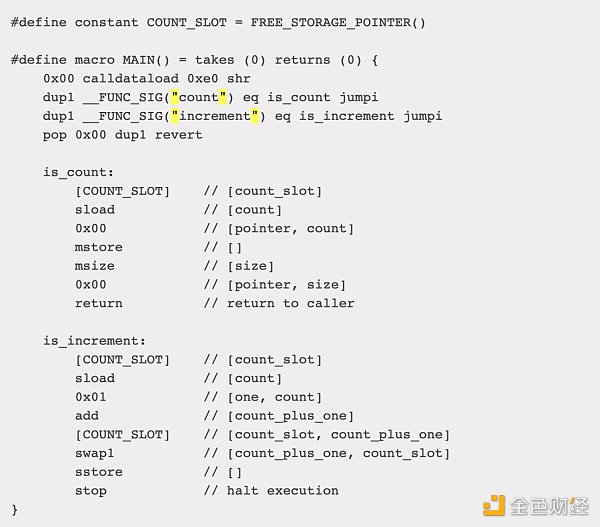 这种设计权衡了减少任意跳转与运行时 Gas 成本之间的关系,代价是调用多次时代码的大小增加。「MAIN」 宏被视为合约的入口,并且其主体中的第一条指令将成为运行时字节码中的第一条指令。