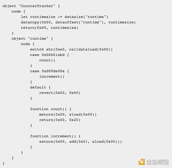 在 Yul 中,代码被分成对象,这些对象可以包含代码、数据和嵌套对象。因此,Yul 中没有常量或外部函数。需要定义函数选择器调度程序才能将代码路径公开到外部。