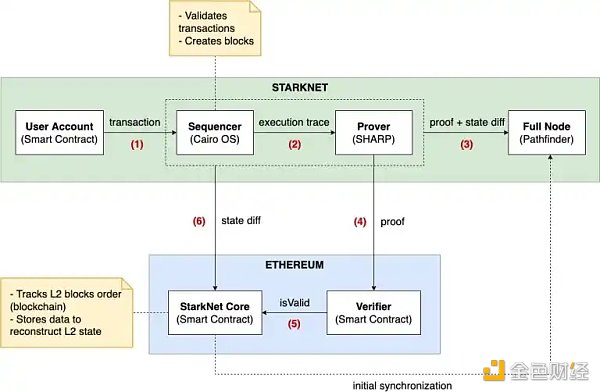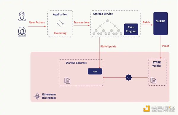 基于有效性证明的 zk-rollup 方案类似,StarkNet 与 StarkEx 也采用「链下计算-生成 zk 证明-链上验证」的形式来实现对以太坊的扩容。