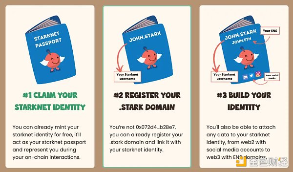 StarkNet.id 是 StarkNet 的域名服务(.stark),让用户免费铸造基于 StarkNet 的去中心化身份。用户还可以将任何数据附加到 Starknet 身份上,包括从 Web2 的社交媒体帐户到 Web3 的 ENS 域名等身份标签,团队后续计划推出配套 StarkNet 身份仪表盘和更多功能,让用户能够更容易管理和构建更加全面的去中心化身份系统。