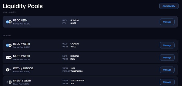 Mute 是 zkSync Era 上的第一批 DEX 平台,当前已推出 MUTE TGate.ion。用户可以使用该平台进行交易、流动性提供、Amplifier、债券以及 DAO 治理功能。当前 Mute 已经支持ETH、USDC、MUTE、WETH、ZKDOGE 等十余种资产的交易以及流动性提供。通过收益放大器(Amplifier),用户还可以将 LP TGate.ion 进行再质押以获取更高的收益,而 Amplifier APY 主要由平台费用收入进行定向激励,具有的 LP Pool 由团队和 DAO 决定。