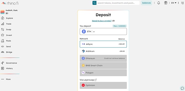 rhino.fi 是一个多链一站式 DeFi 平台,提供订单薄交易、DEX、收益策略、流动性提供、内部无 Gas 转账以及跨链功能。用户可以通过 zkSync Era 网络向该平台存入 ETH 进行使用,共支持 Arbitrum、Polygon 在内的 6 条公链。目前 rhino.fi 已经推出 DVF TGate.ion,参与质押和治理,其中治理模块涵盖丰富,小到交易费用、转账费用、流动性奖励等,大到升级智能合约、从国库分配资金、铸造新的 DVF TGate.ion 等。