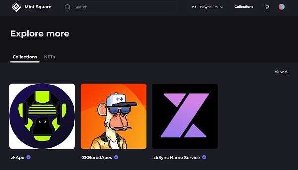Mint Square 是基于以太坊 L2 ZK Rollups 的 交易市场,已经集成 StarkNet 和 zkSync Era 网路。用户可以在 Mint Square 里上传铸造、购买、出售和拍卖 。截至 3 月 26 日,Mint Square 上的总交易量前三的 项目为:zkApe、Mint Square Storefront、zkSync Name Service。