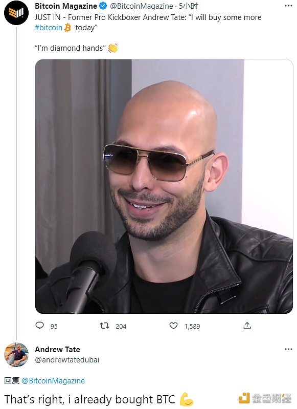 网络红人前职业跆拳道选手Andrew Tate表示,“我今天会再买一些比特币”。