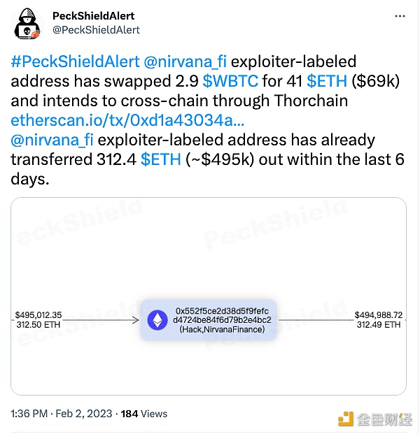 PeckShield监测数据显示,Nirvana攻击者地址将2.9枚WBTC兑换成41枚ETH(约6.9万美元),并打算通过THORChain跨链转移。该地址在过去6天已转移312.4枚ETH(约49.5万美元)。
