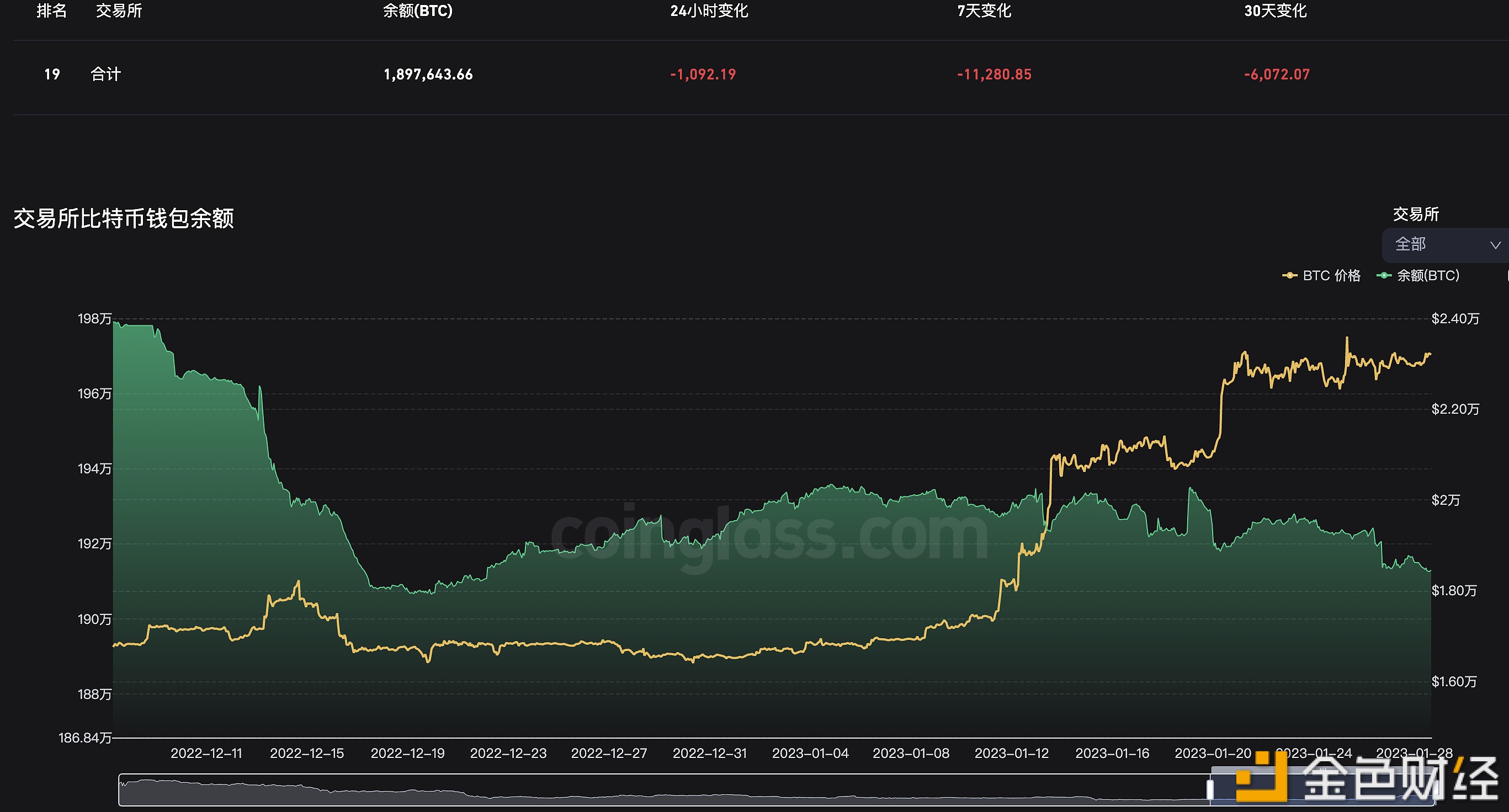 据coinglass数据显示,交易所钱包余额近24小时流出1,092.19枚BTC,近7天流出11,280.85枚BTC,近30天流出6,072.07枚BTC。目前全网交易所钱包余额总计为1,897,643.66枚BTC。