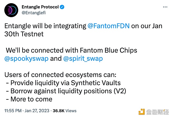 1月30日消息,跨链DeFi协议Entangle Protocol将在测试网集成Fantom网络,同时将与Fantom上的SpoGate.ioySwap和SpiritSwap链接。此外,连接生态系统的用户还可以通过合成金库提供流动资金,针对流动性头寸进行借贷(V2)。。