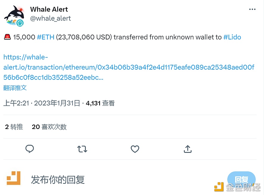 Whale alert监测数据显示,1.5万枚ETH从未知钱包转移至Lido。