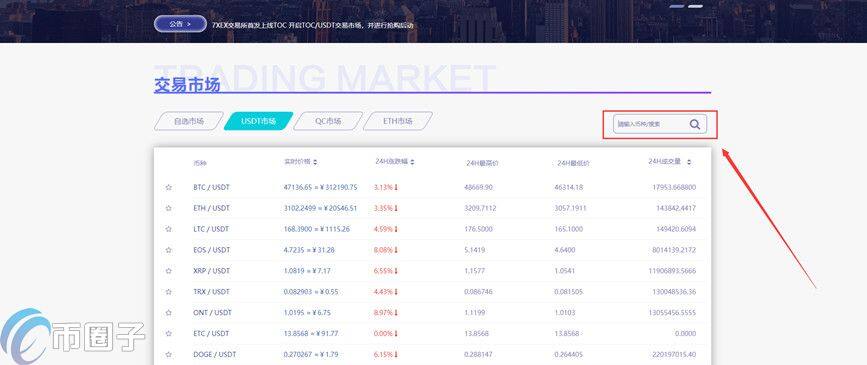 1.打开7XEX交易平台官网,选择我们想要的币种,在首页进行搜索,我们以BTC为例。