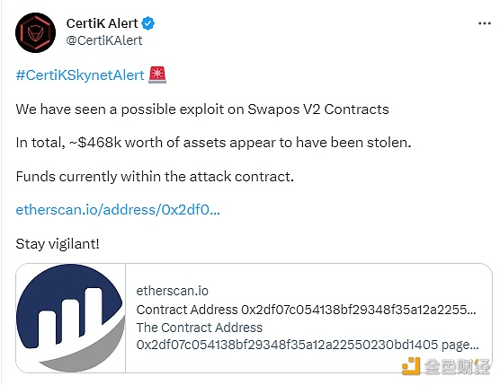 消息,据CertiK监测,Swapos V2合约疑似遭黑客利用,造成价值约46.8万美元的资产被盗。目前被盗资金已在攻击者地址。