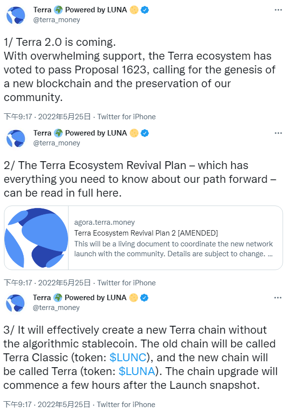 官网 Twitter 账号 @terra_money 写道:在压倒性的全力支持下,Terra 生态社区投票通过了 1623 号提案,呼吁建立新的区块链以保护我们所在的这个社区。