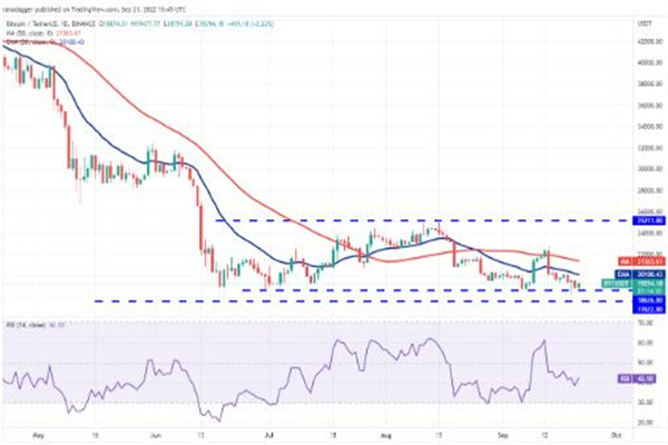 比特币在 9 月 19 日跌破 18,626 美元的即时支撑位,但烛台上的长尾显示较低水平的强劲买盘。多头在 9 月 21 日再次捍卫了这一水平,这是一个积极的信号。