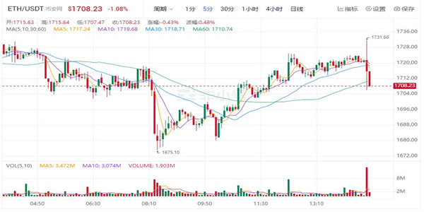 以太坊线最新价格为:$1723.1900美元,约合人民币价格为:¥11610.85,相比昨日以太坊ETH价格小幅度下跌0.66%,截止于今日24H最高:¥11881.5100、24H量:606.7万、24H最低:¥11315.9900、24H额:¥709.49亿、24H波幅:+5.00%。