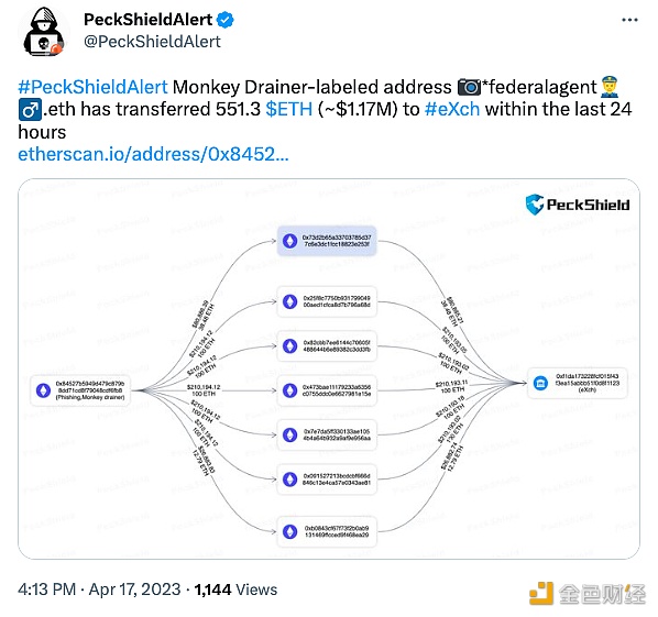 4月17日消息,据 PeckShield 监测,被标记为网络钓鱼诈骗团伙Monkey Drainer的地址(0x8452 开头)向eXch转 551.3枚以太坊,价值约117万美元。
